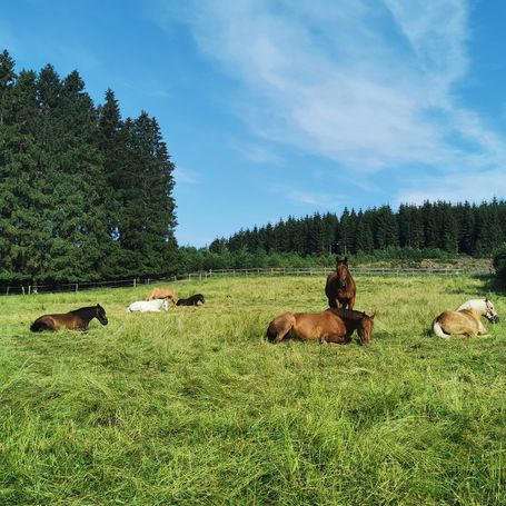 Während der Weidesaison stehen den Pferden ca. 5 ha Weideland direkt angrenzend an das Stallgebäude zur Verfügung. Die Beweidung erfolgt durch Umtriebsweiden. Anschließend wird die Fläche ausgemäht und abgezoge. Durch entsprechende Weideruhe halten wir unsere Weiden und Pferde gesund.